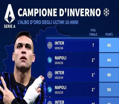 国米45分拿到意甲半程冠军,此前9个赛季半程冠军6队最终夺冠