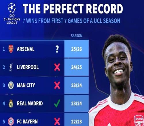 阿森纳是欧冠历史第10支开季7连胜的球队,此前仅2队最终夺冠 -